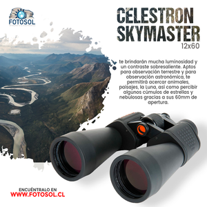 Los Skymaster 12x60 te brindarán mucha luminosidad y un contraste sobresaliente. Aptos para observación terrestre y para observación astronómica, te permitirá acercar animales, paisajes, la Luna, así como percibir algunos cúmulos de estrellas y nebulosas gracias a sus 60mm de apertura. Incluye bolso de transporte, correa para el cuello reforzada, paño de limpieza y tapas protectoras.